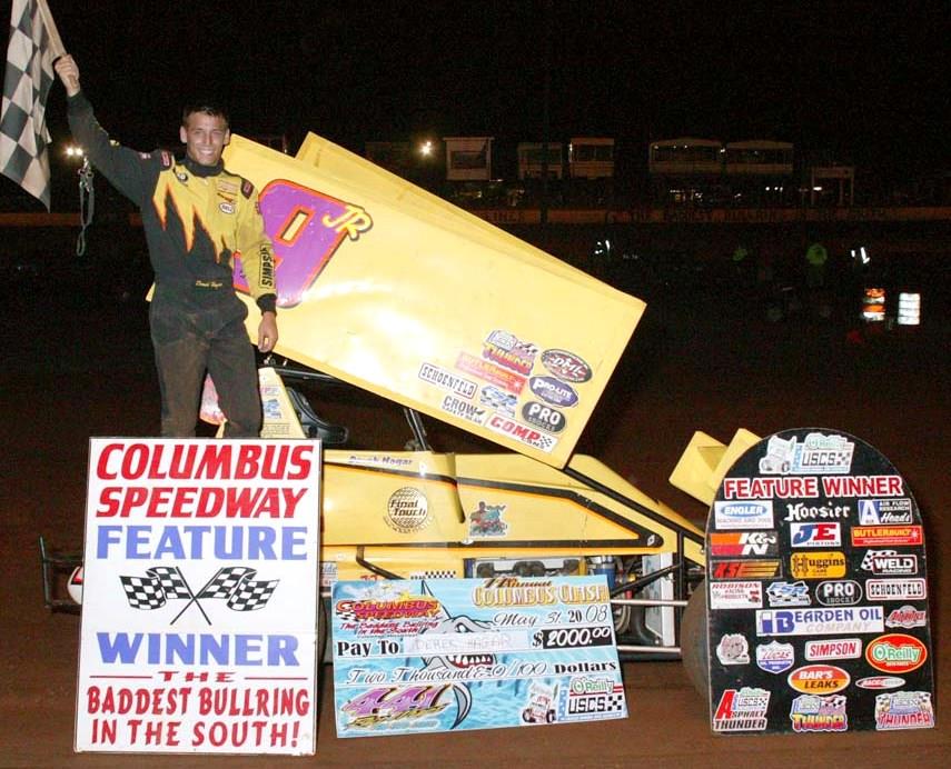 May 31, 2008 Columbus, MS – 2006 O’Reilly United Sprint Car Series Rookie of the year, Derek Hagar from Marion, Arkansas recovered from a bad night at North Alabama Speedway on Friday to scorch the competition in the 30-lap O’Reilly United Sprint Car Series Speedweek 2008 Finale presented by Lucas Oil at Columbus Speedway. The talented seventeen year-old led every lap of main event while racing high on the race track with his right rear tire against the wall most of the distance around the historic 3/10 mile red clay oval known as the “Baddest Bullring in the South”. It was the talented young gun’s third O’Reilly USCS feature win over the past year.