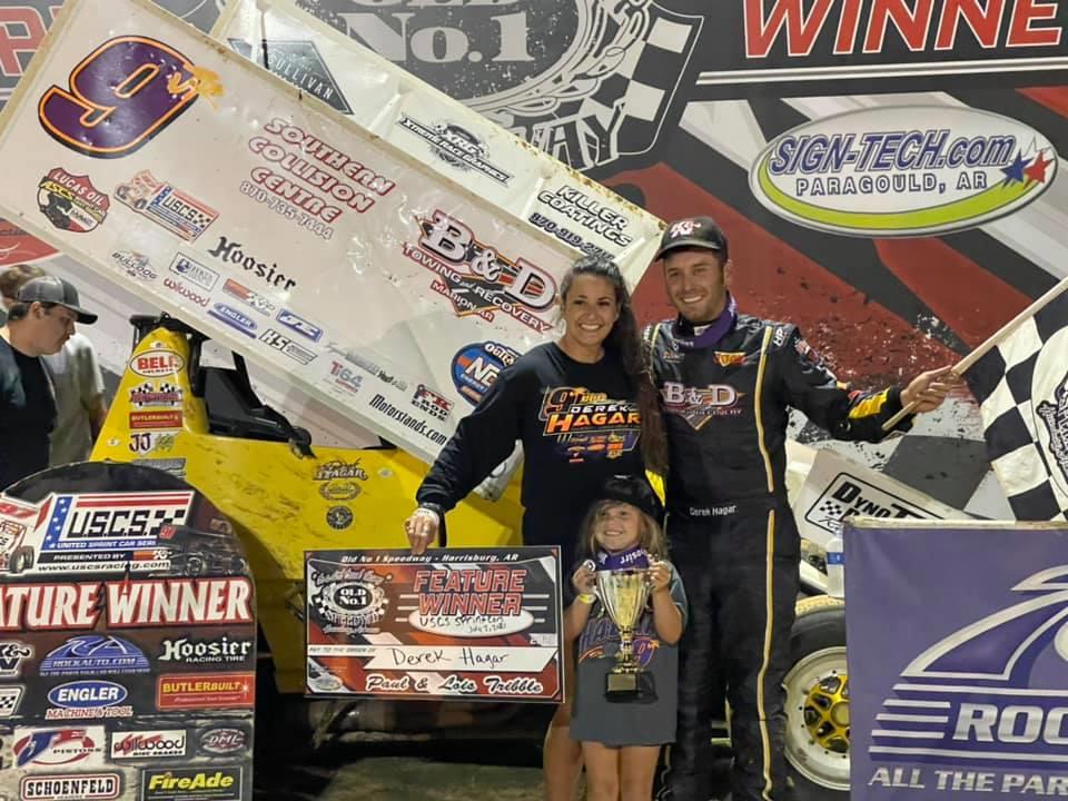 Hagar won a heat race from second and the feature from third on Friday at Old No. 1 Speedway in Harrisburg, Ark. It marked his first career win at the track.
