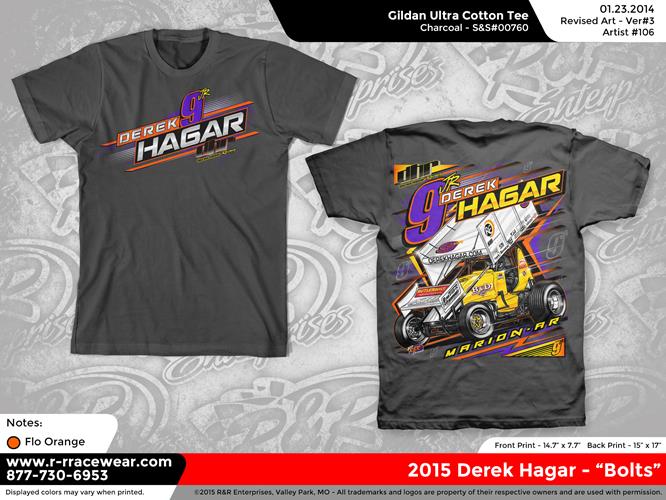 Pick up the latest Derek Hagar Racing t-shirts today! The colors are blue, black and gray. The sizes range from adult small to extra large. Some 2XL are available for $25.